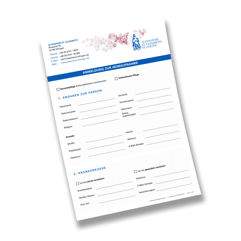 Laden Sie zuerst die Anmeldung herunter und füllen diese aus. Anschließend speichern Sie das Dokument ab und senden es uns per Mail an info@altenheim-ellingen.de