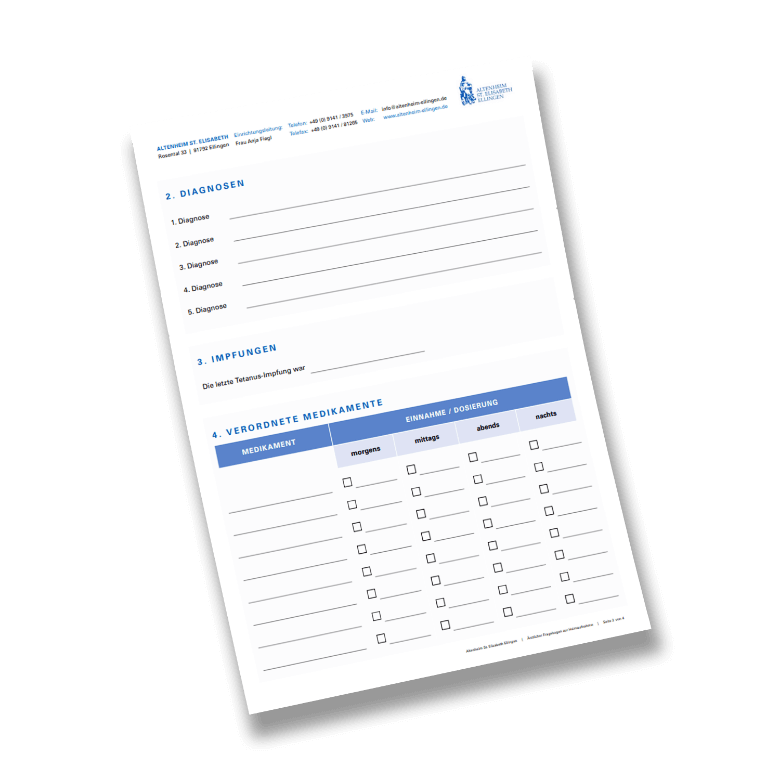 Laden Sie zuerst den Fragebogen herunter und füllen diesen aus. Anschließend speichern Sie das Dokument ab und senden es uns per Mail an info@altenheim-ellingen.de
